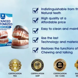 Instant Perfect Smile: Transform your smile instantly with the . Experience the satisfaction of achieving a flawless. customized fit right away. Our innovative denture set eliminates the discomfort of poorly fitting dentures. offering you a snug and natural feel that makes your dentures feel like a true part of your mouth. Say goodbye to sore spots and irritation as Denture Set provides immediate relief. allowing you to enjoy your smile with newfound confidence and comfort. Enjoy a seamless transition to a better-fitting. more comfortable denture experience without delay.