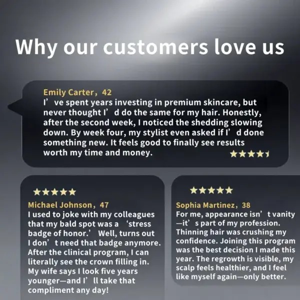 “My stressful schedule gave me a shiny bare spot at my crown—felt like my scalp had its own spotlight! Three weeks into the trial, new hairs started filling in. Now I can actually focus on work without obsessively checking the mirror… though I do sneak a peek sometimes, just to admire my regrowth!”