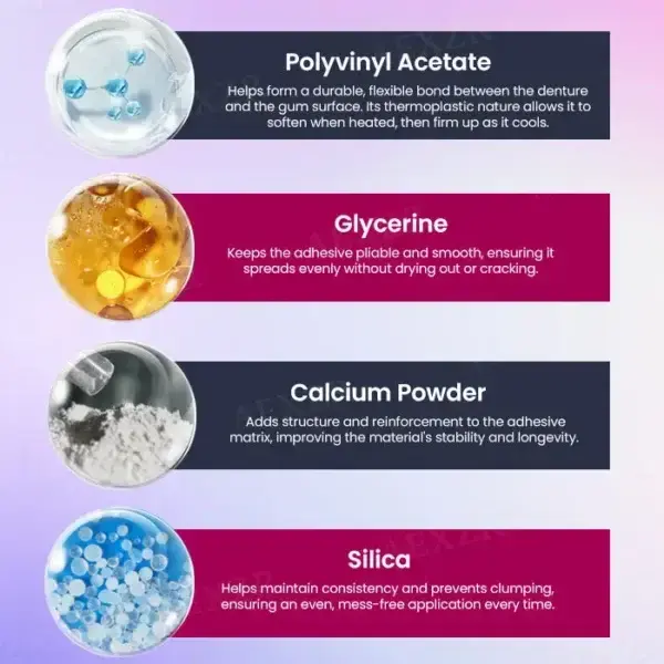 A key binding agent known for its excellent adhesion properties, Polyvinyl Acetate helps form a durable, flexible bond between the denture and the gum surface. Its thermoplastic nature allows it to soften when heated, then firm up as it cools—creating a custom-fit seal that stays in place for days.
